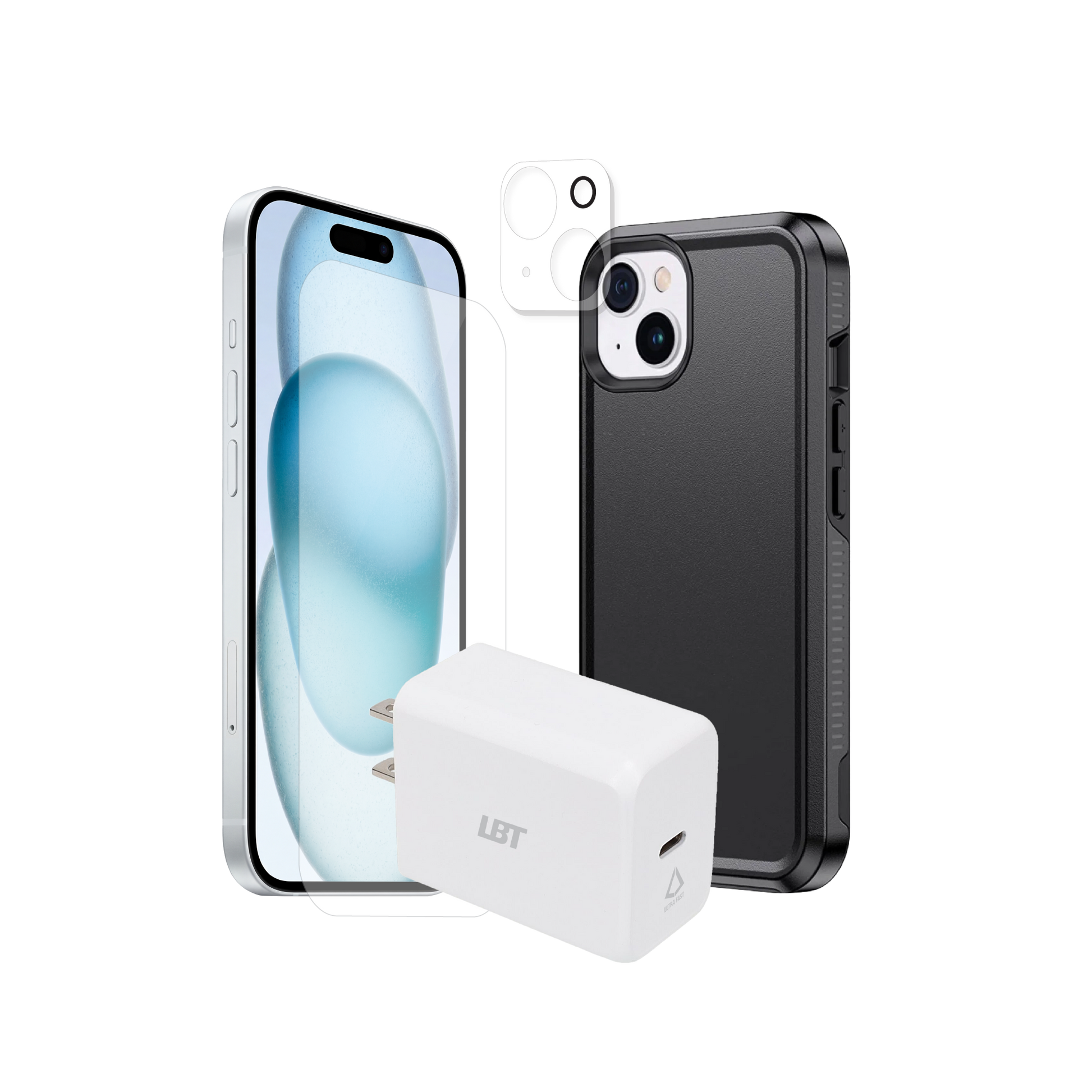 Pack 4-en-1 pour iPhone 15 : coque antichoc, verre trempé, protection d’objectif, chargeur PD 30 W