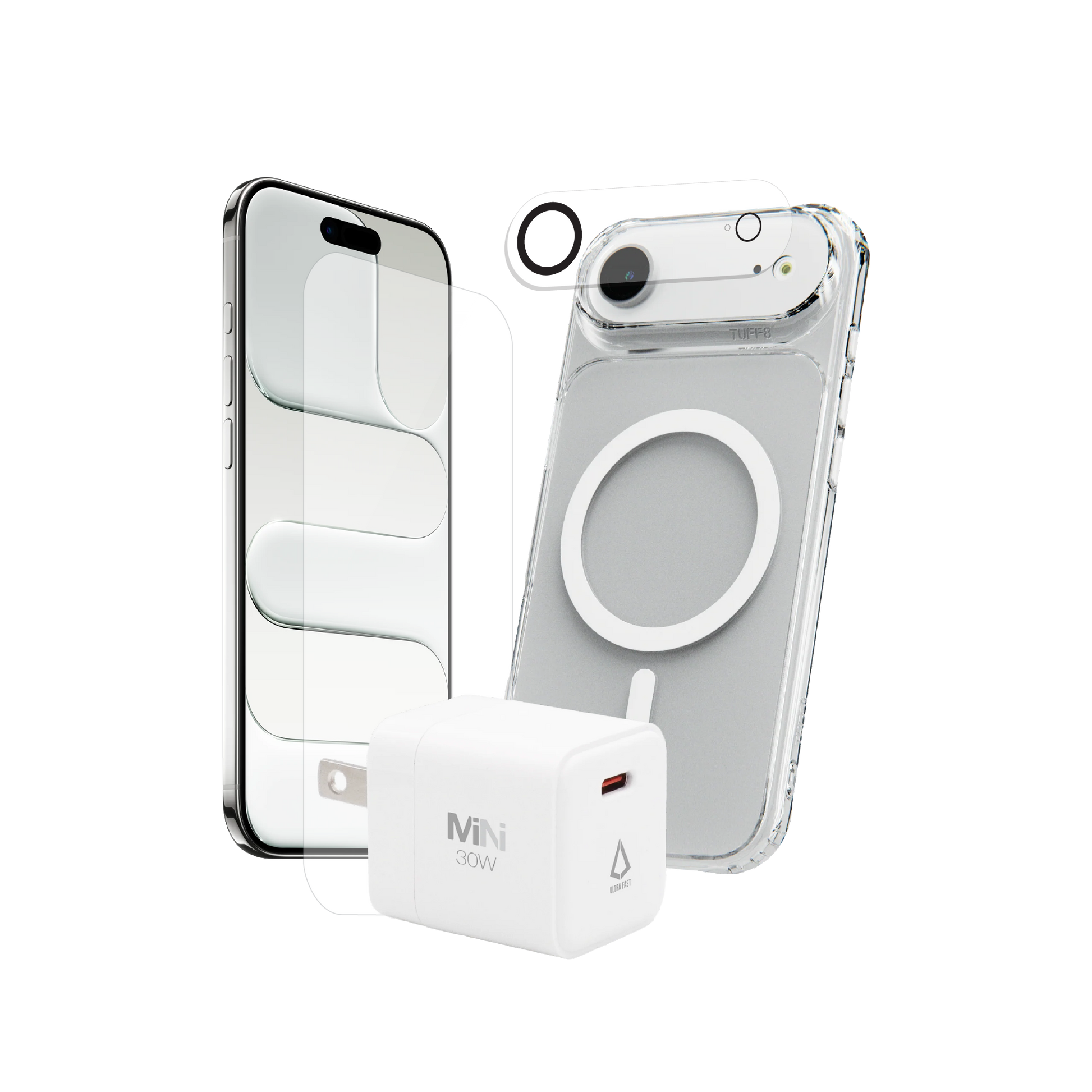 Pack 4-en-1 pour iPhone 17 Air : coque magnétique transparente, protection d’objectif, verre trempé, chargeur PD 30 W