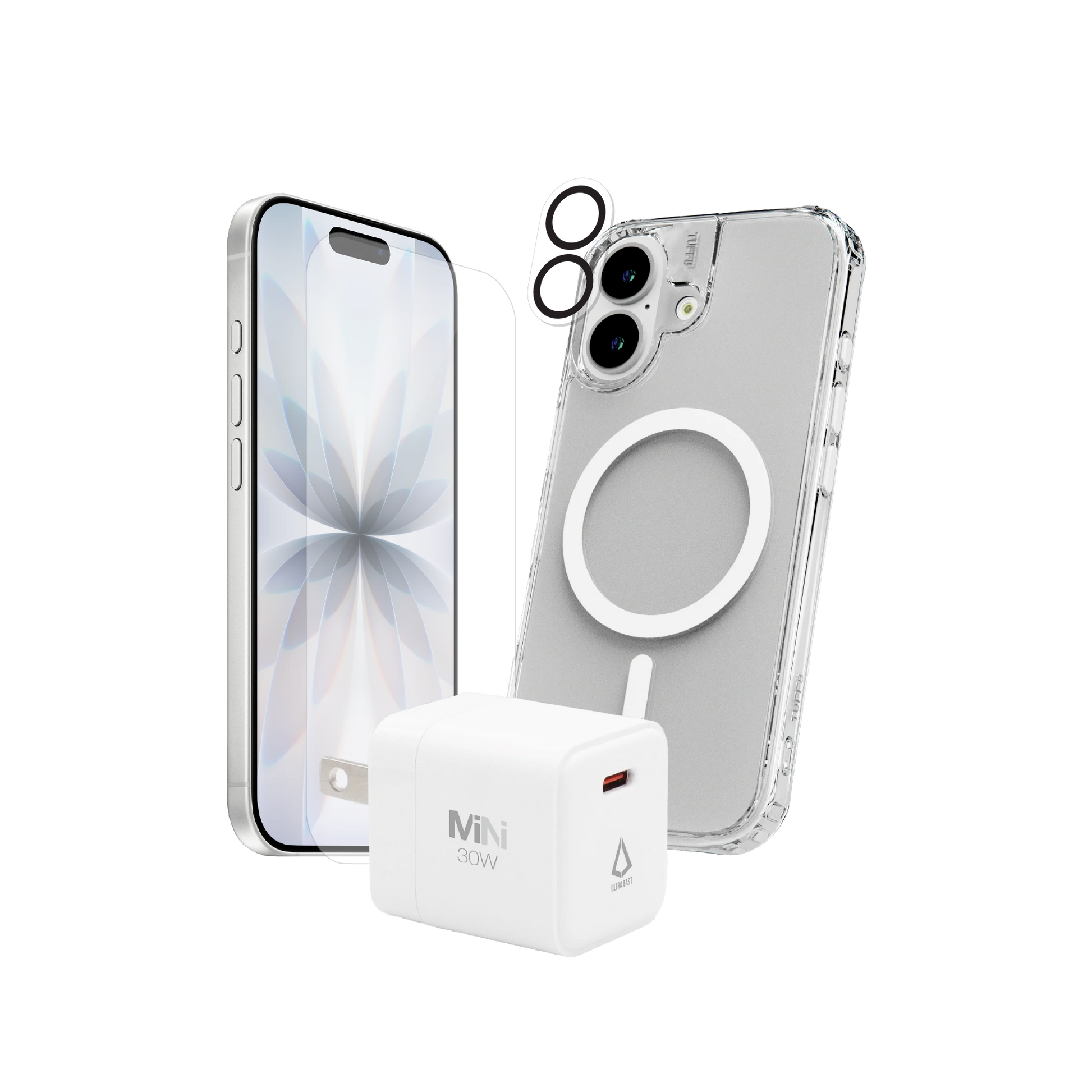 Pack 4-en-1 pour iPhone 17 : coque magnétique transparente, protection d’objectif, verre trempé, chargeur PD 30 W