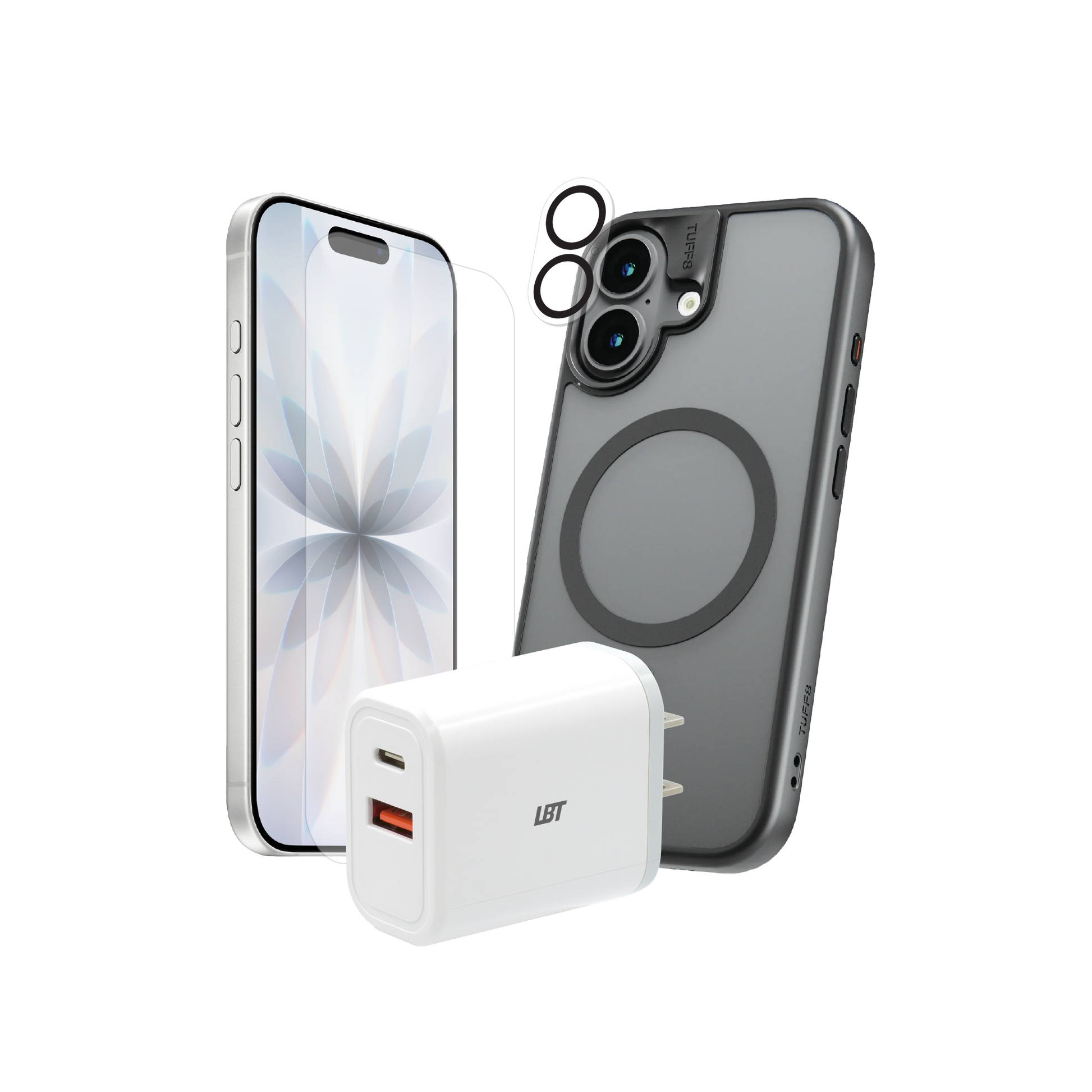 Pack 4-en-1 pour iPhone 17 : coque GlideGuard, verre trempé, protection d’objectif, chargeur PD 35 W